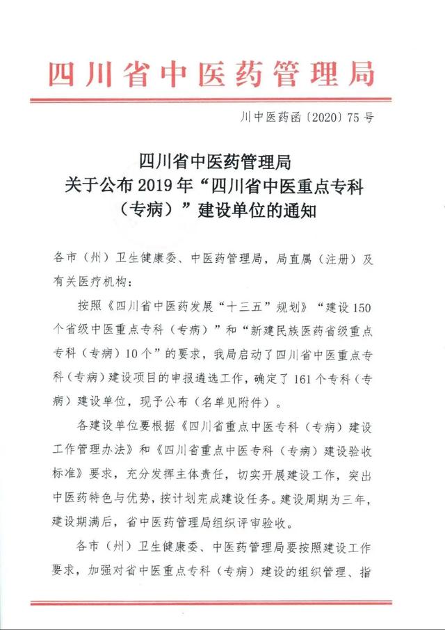 6月9日,四川省中医药管理局公布了2019年“四川省中医重点专科”建设单位的通知,郫都区中医医院重症医学科、妇科、老年病科3个专科成功获批。