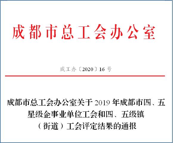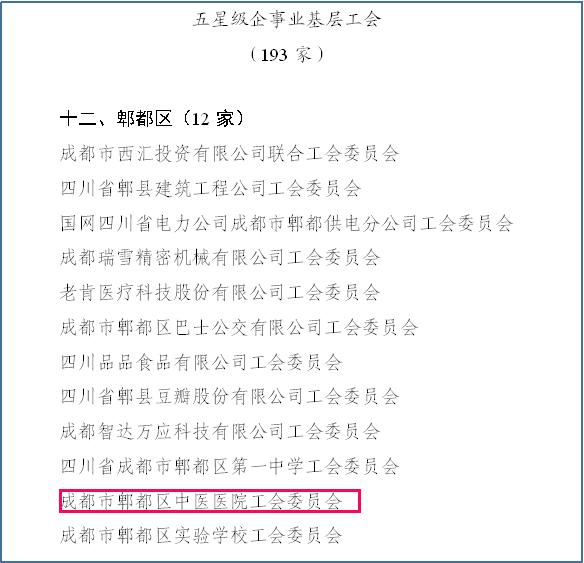根据《成都市企事业单位工会建设星级评定暂行办法》要求,成都市总工会以深化“强基层、补短板、增活力”为目标,在全市范围内开展了工会评星定级工作。郫都区中医医院工会在区总工会的指导下,积极响应主动申报,对照多条评级标准,认真自查整改、查漏补缺。通过各级工会逐级评审、交叉检查、实地考评验收等程序,近日,该院工会被成都市总工会评为首批“成都市五星级工会”。