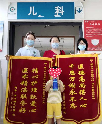 7月18日上午,患儿家属将两面"精心护理献爱心 医术精湛服务好"和"医德高尚得人心 千恩万谢永不忘"的锦旗送到绵竹市人民医院儿科,以分别表达对主管医生冯文华医生及儿科全体医护人员的精湛医术和高尚医德的感激之情。