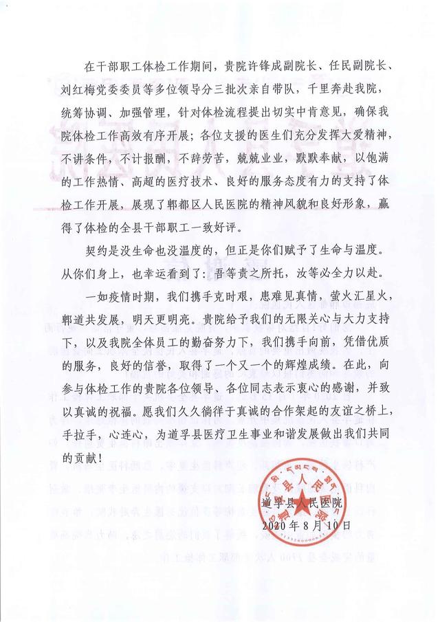 党的十八大以后,随着医疗体制改革逐步推进,分级诊疗战略的深入实施,在进一步改善医疗服行动计划的政策引导下,郫都区人民医院积极探索建立分工明确、协作密切的新型卫生服务体系,与道孚县人民医院、筠连县人民医院、安德街道卫生院及区内十三家乡镇卫生院等签订医联体协议,让患者的安全就医得到有力技术保障,使郫都区人民医院诊疗水平有了质的提高,服务能力得到了极大提升。道孚县人民医院的这封特殊的感谢信为我院更好地打造医联体建设打了一针强心剂。