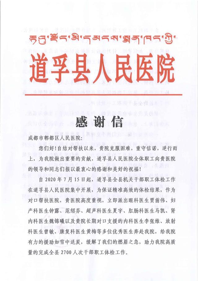 8月10日上午,成都市郫都区人民医院收到一封特殊的感谢信,这封感谢信来自医联体单位道孚县人民医院。自2017年6月至今,成都市郫都区人民医院与道孚县人民医院建立紧密型医疗联合体已整整三年,期间通过"医院对医院、学科对学科、团队对团队"的形式,以及"紧密型"的合作方式,在业务、管理等方面为道孚县人民医院提供专业人才以及相关人才培训,极大地提升了当地医疗卫生水平,让患者在家门口就能享受到三级医院专家的诊疗技术,真正意义上缓解了"看病难、看病贵"问题。