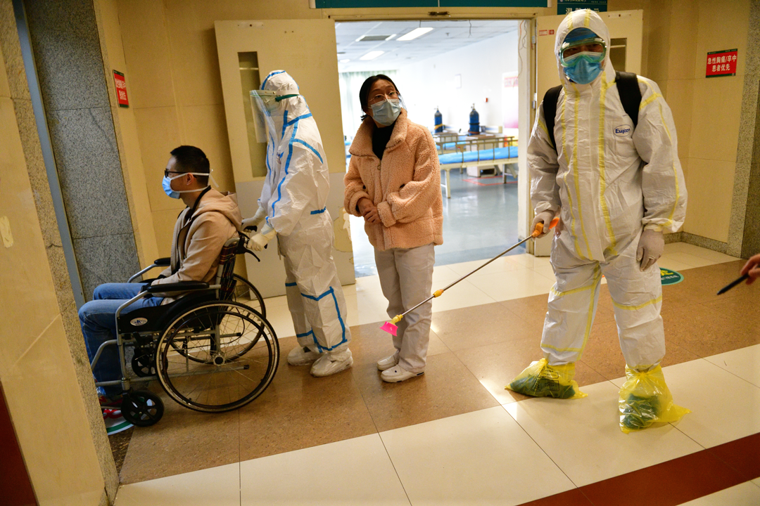 演练场景模拟普通病区的患者住院期间出现发热/呼吸道症状后,经询问病史及检查,高度疑似新冠肺炎患者,立即置患者于应急隔离病房,科室的医务人员落实好感染防护措施,并转运患者做相关检查,通过院内专家会诊,确诊新冠肺炎感染的患者转入隔离病区进行隔离治疗。普通病区立即实施封闭,对密切接触者实施隔离,落实床单元、环境、物表、空气的终末清洁消毒。