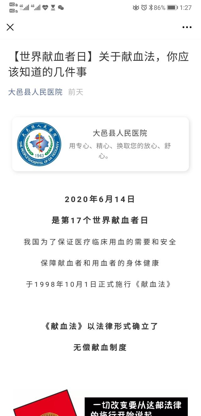 2020年6月13日,医院微信公众号发表文章《世界献血者日,安全血液拯救生命,献血知识你了解多少?》、《世界献血者日,关于献血法,你应该知道的几件事》,对献血知识的普及和《献血法》宣传起到了积极的推动作用。