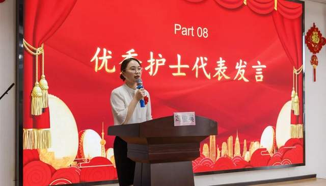 在随后的表扬大会上,护理部主任郭涛主要从护理重点工作以及护理团队取得的成绩两个方面进行了工作汇报,并为全体护理人员送去了节日的祝福。